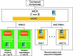 Каждый мезонинный модуль AMC содержит контроллер управления MMC (Module Management Controller) (рис.3). Он выполняет контроль основных параметров аппаратуры модуля: напряжения питания, токов потребления модуля AMC в целом и его отдельных функциональных блоков, температуры микросхем и ряда других.